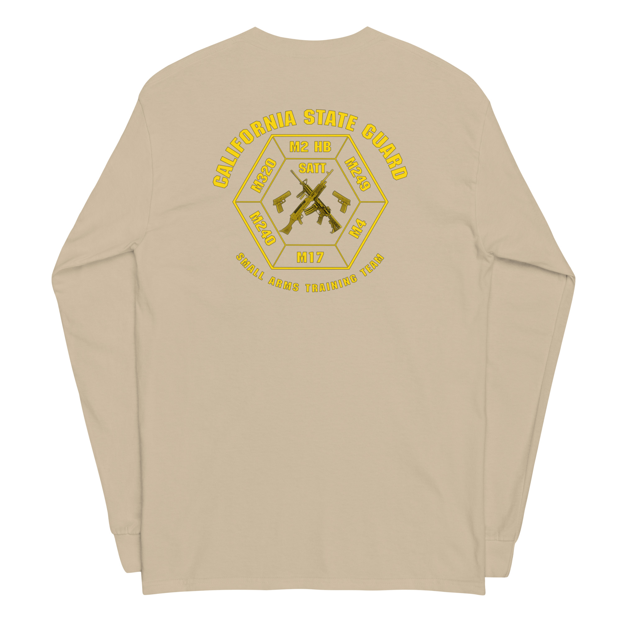 Gear up with the California State Guard Small Arms Training Team long sleeve T-shirt, designed to embody the spirit and precision of the SATT. This robust long sleeve T-shirt showcases the SATT logo neatly placed on the top left of the front and in a larger format on the back for impactful visibility. It also features a subdued, reversed California State Guard State Flag patch on the sleeve, representing the wearer’s forward movement, as if a flag were trailing in the breeze. Completing this design, the left sleeve proudly displays the acronym “SATT,” symbolizing the unity and strength of the unit. Perfect for both tactical exercises and casual wear, this T-shirt combines functionality with a sense of pride and commitment to service.