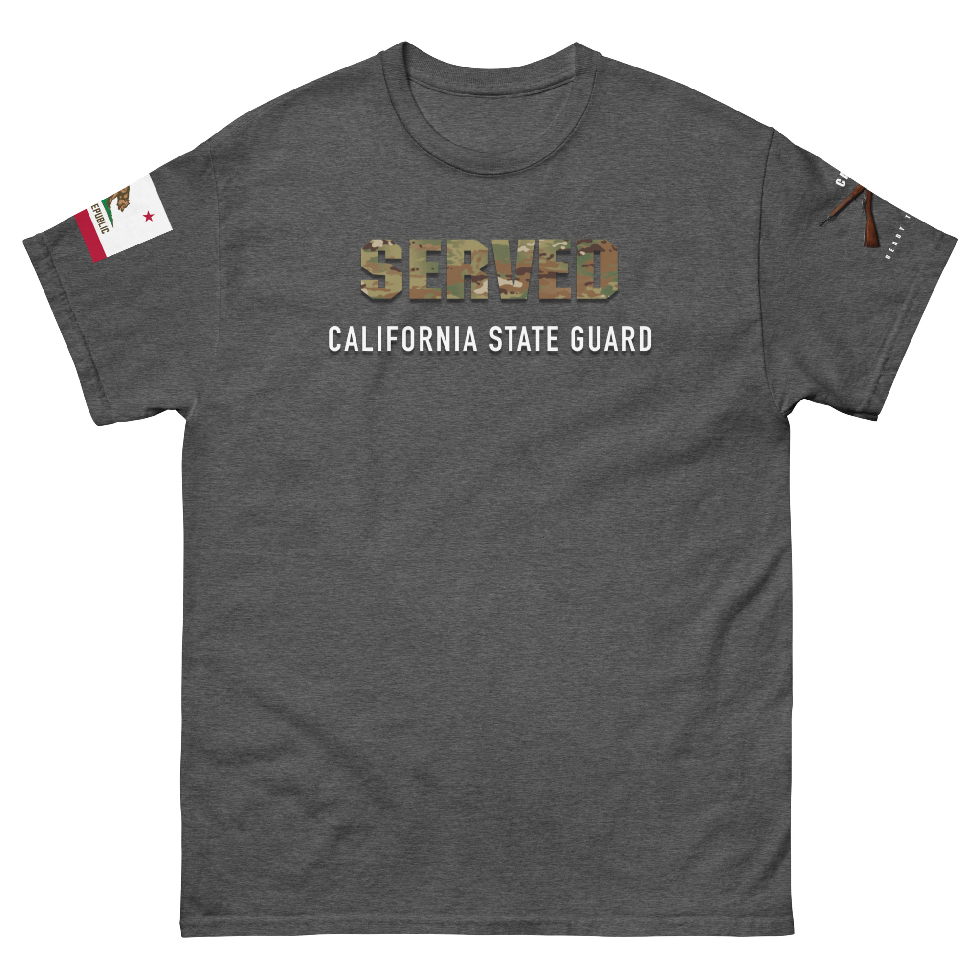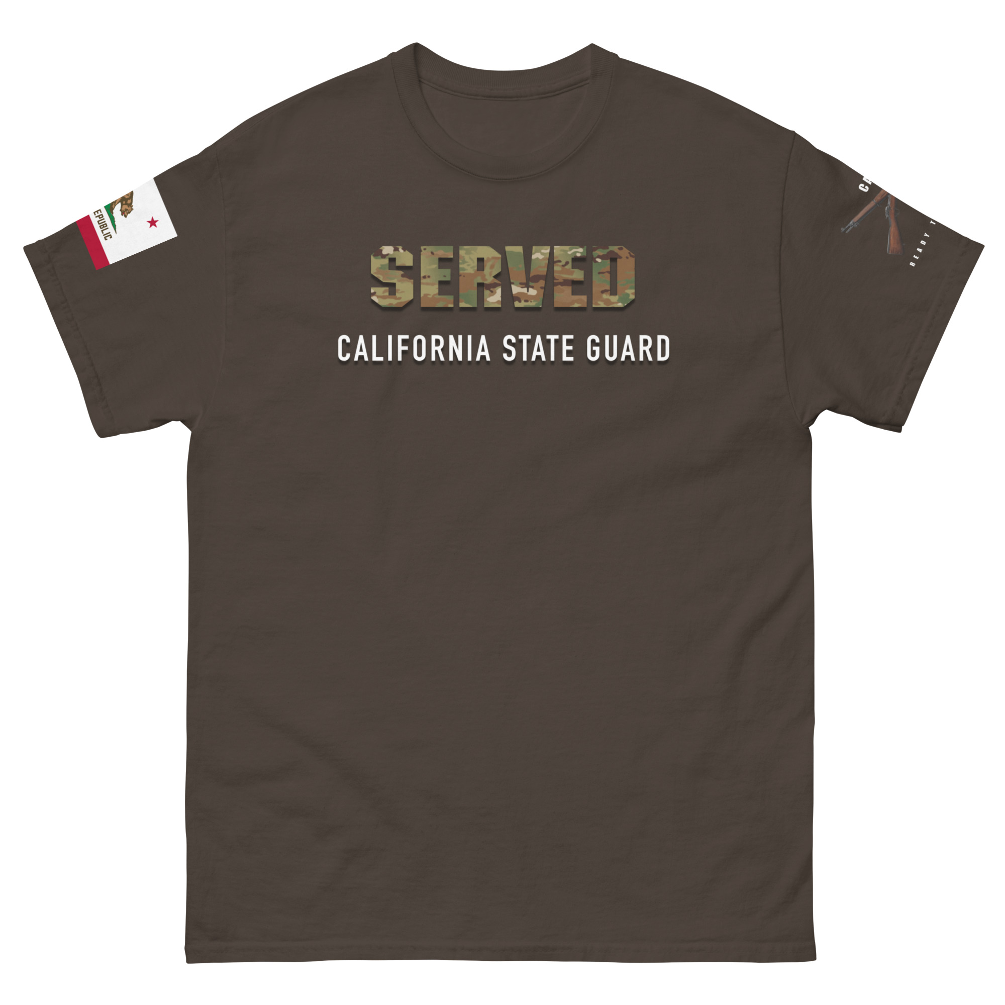 We made a custom T-Shirt for those who served in The California State Guard. The shirt features SERVED in OCP Pattern letters on the front of the shirt with The California State Guard printed below. It also features cross rifles (M1903) on the left shoulder sleeve and the California State Flag on the right.