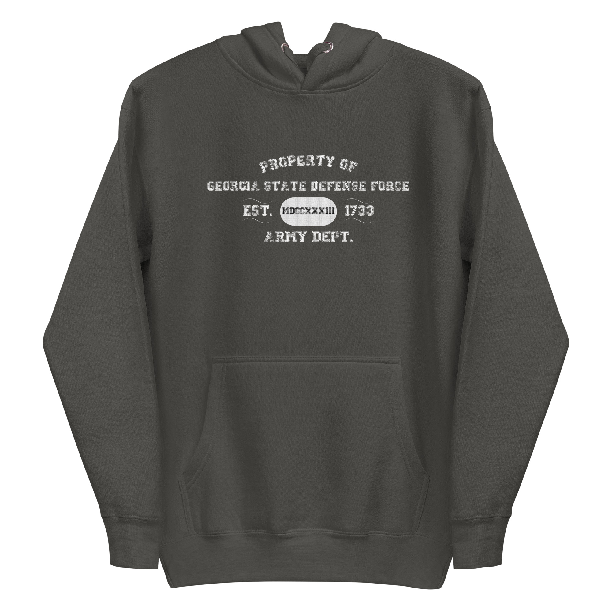 This hoodie design proudly displays “Property of Georgia State Defense Force, Est. 1733,” honoring the nearly 300-year history of the Georgia State Defense Force. The founding year is shown in both numerals and Roman numerals for a bold, classic style. Below the date, “Army Dept.” is featured, signifying the force’s integral role within the state’s military structure. This hoodie combines a sense of tradition with a modern look, celebrating the enduring legacy of the Georgia State Defense Force’s service and commitment.