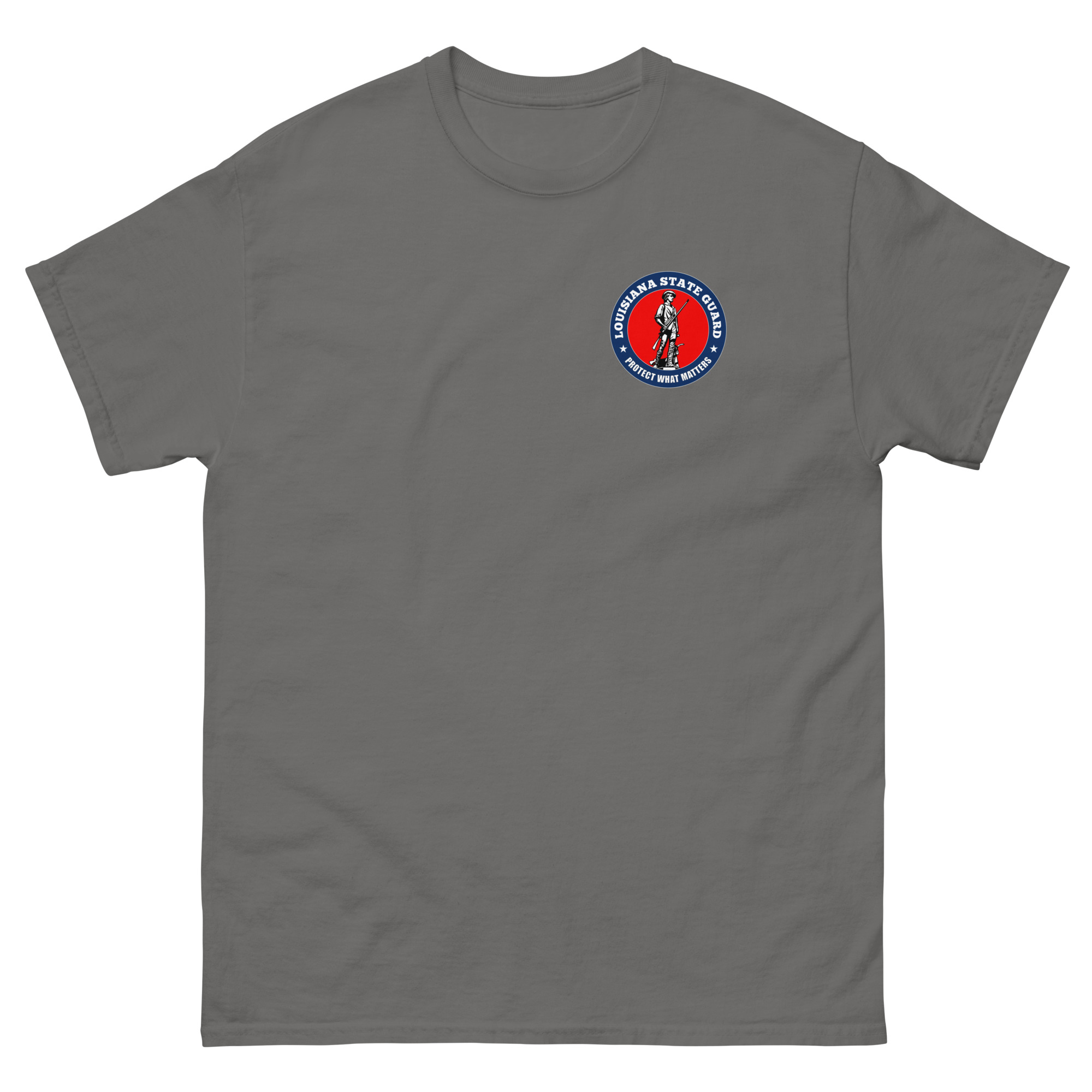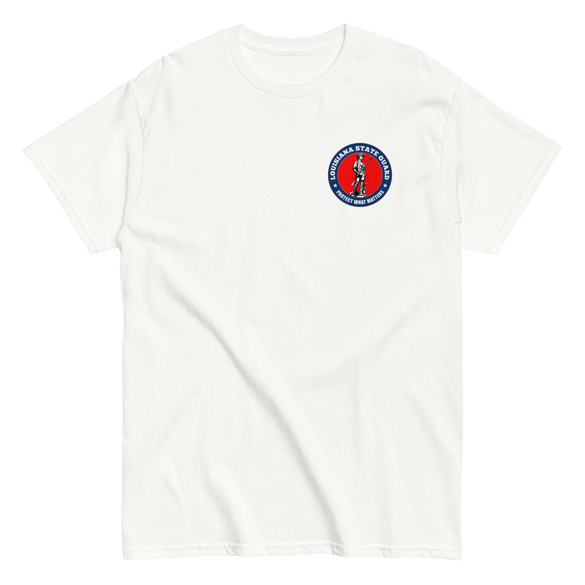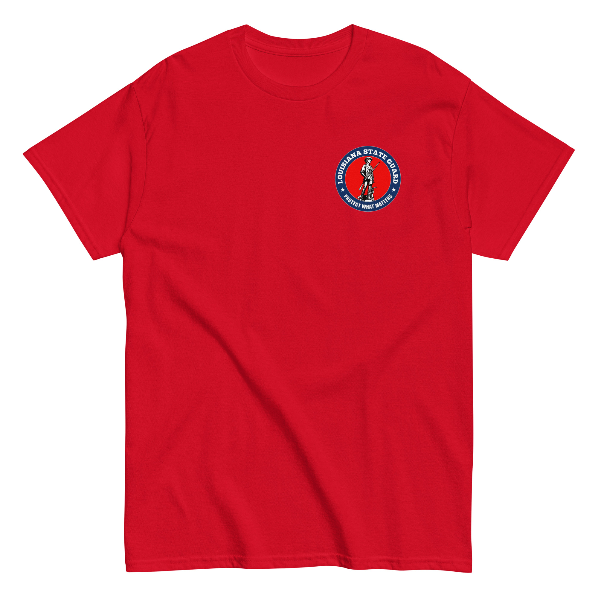 We designed a custom Louisiana State Guard T-Shirt featuring The American Minuteman highlighted in bold red.