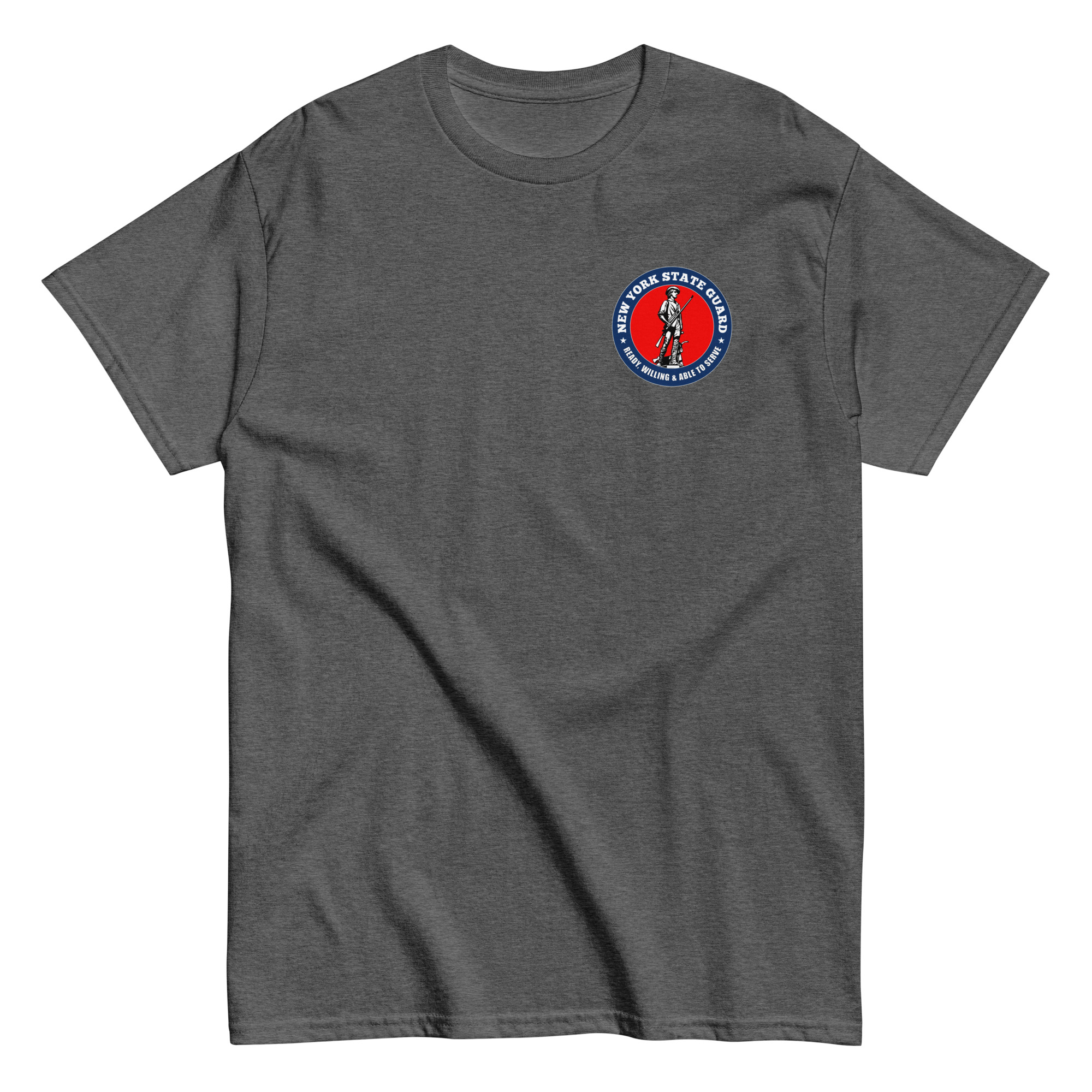 We designed a custom New York Guard T-Shirt written on the shirt as New York State Guard & The American Minuteman highlighted in bold red. Throughout the state The New York Guard is known as The State Guard so we wanted to make sure we provide you an alternative shirt