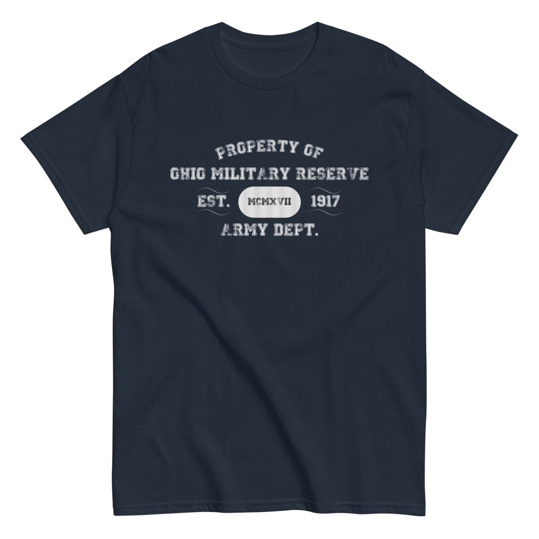 This new T-shirt design proudly features “Property of Ohio Military Reserve, Est. 1917” paying tribute to the long and storied history of the Ohio Military Reserve. The year 1917 is displayed both in numerals and Roman numerals for a classic and bold aesthetic. Beneath the founding date, “Army Dept.” is mentioned, reflecting the Ohio Military Reserve’s important role within the military structure of the state. This design blends tradition with a modern look, honoring the Ohio Military Reserve’s legacy of service and dedication.