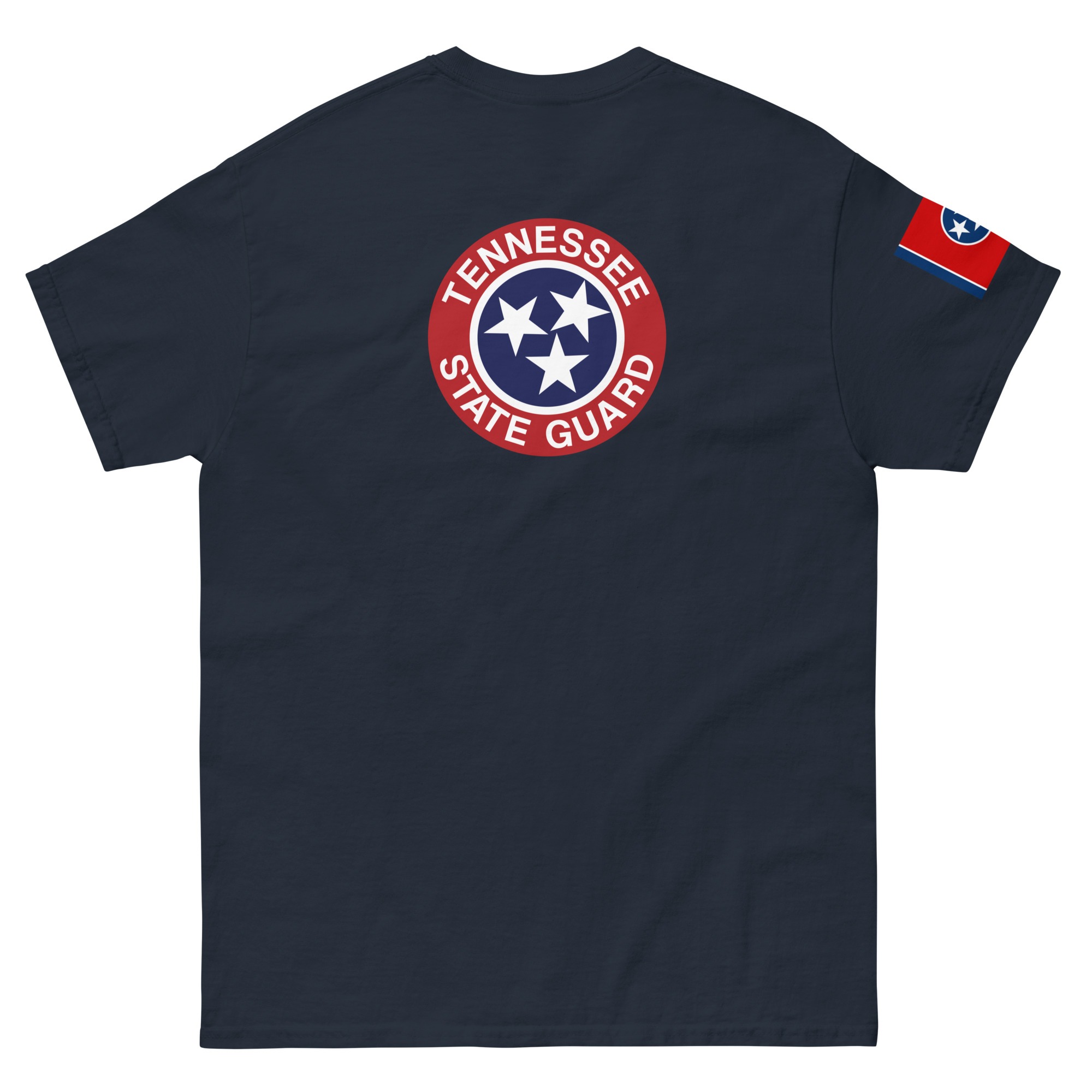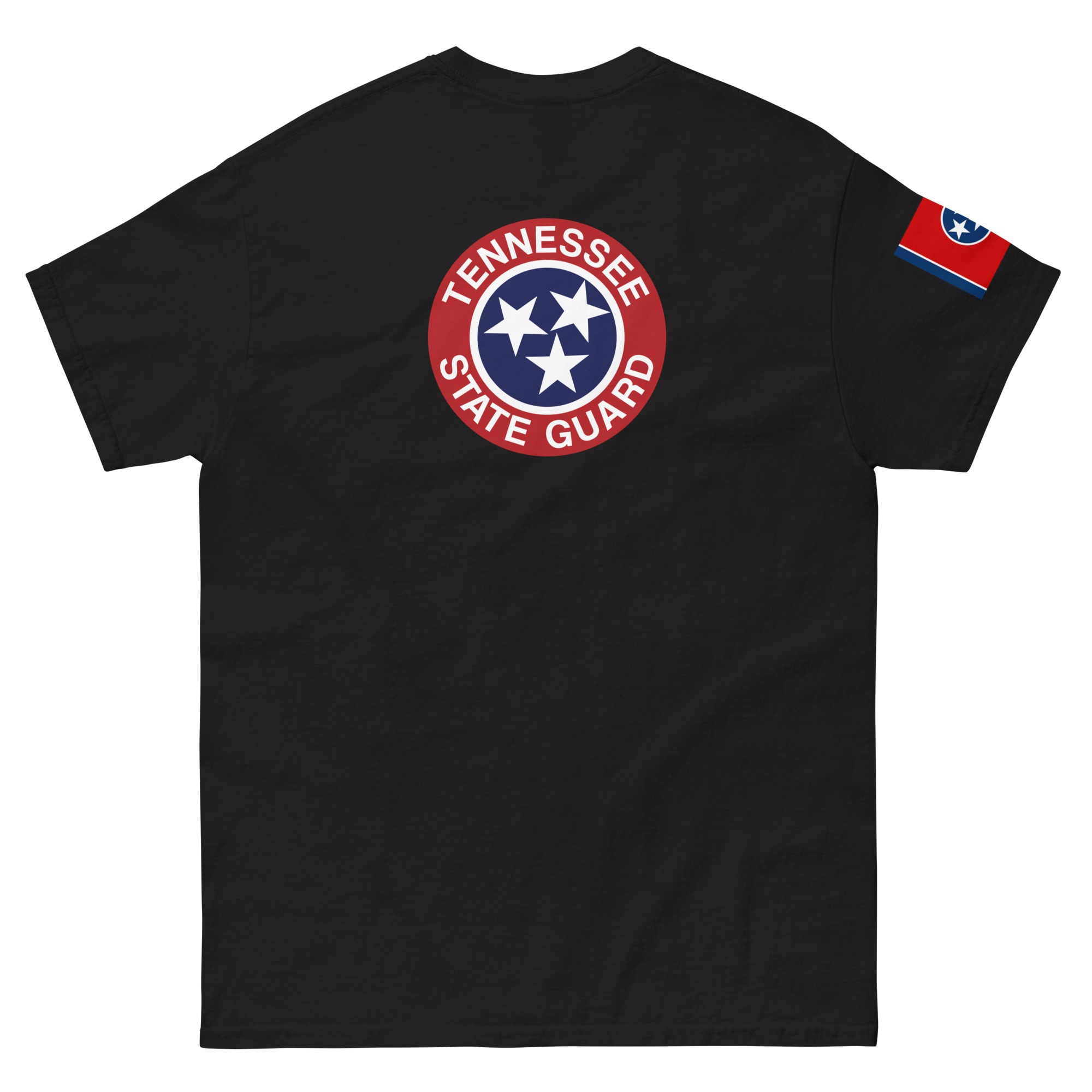 Designed by The Tennessee State Guard. The T-Shirt features the letters TNSG on the front, the Tennessee State Flag on the right shoulder in reverse to signify March of the Colors. Also featured on the back is The Tennessee State Guard logo.