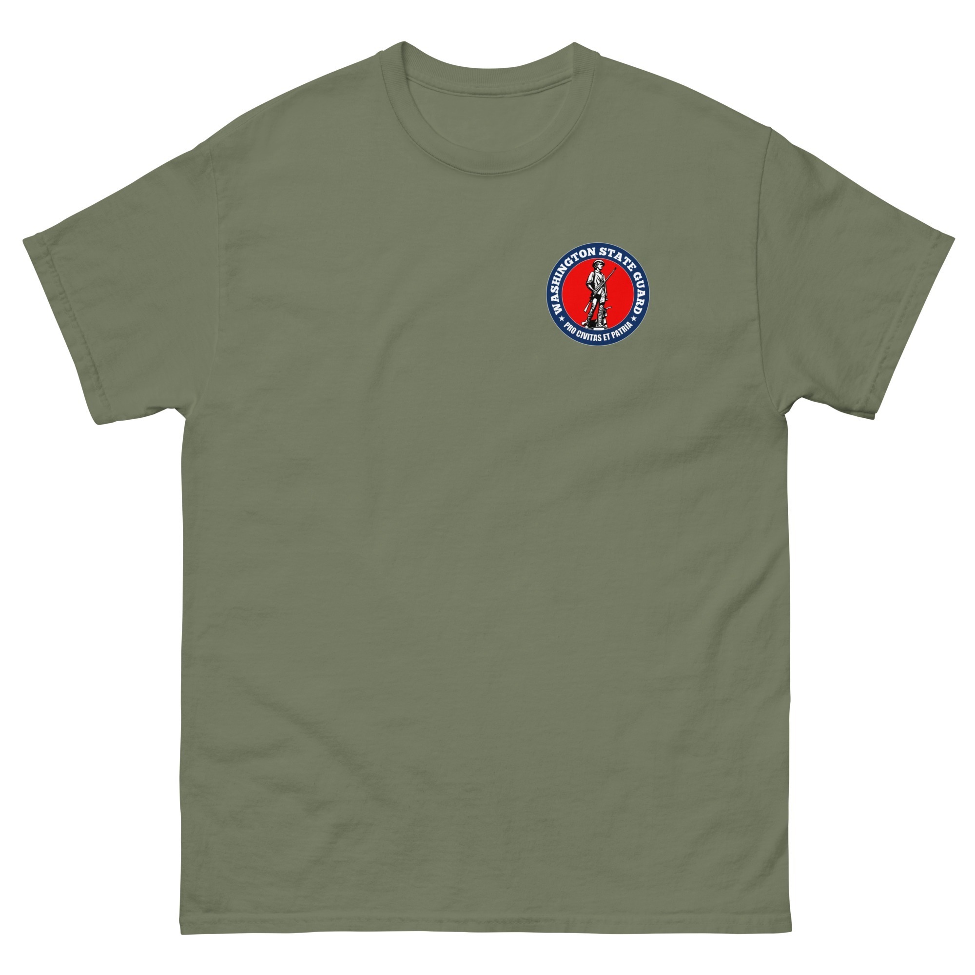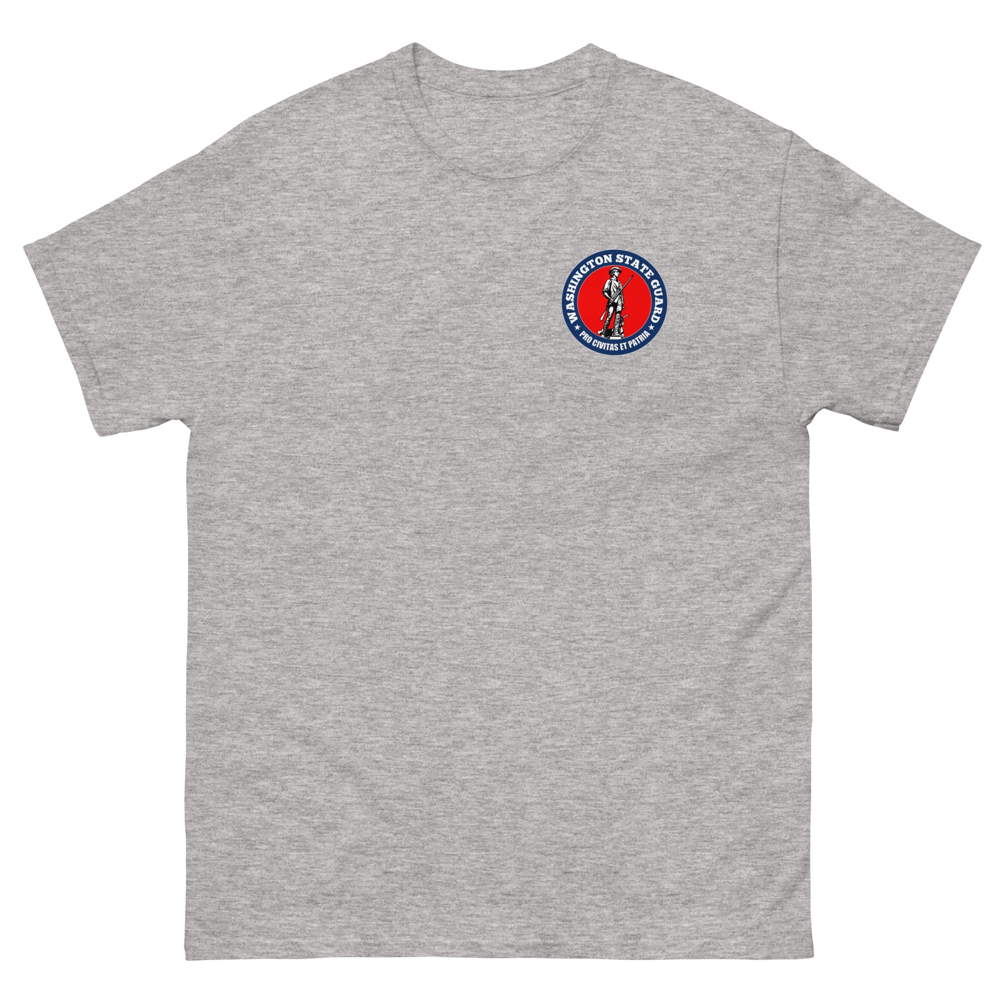 We designed a custom Washington State Guard T-Shirt featuring The American Minuteman highlighted in bold red.